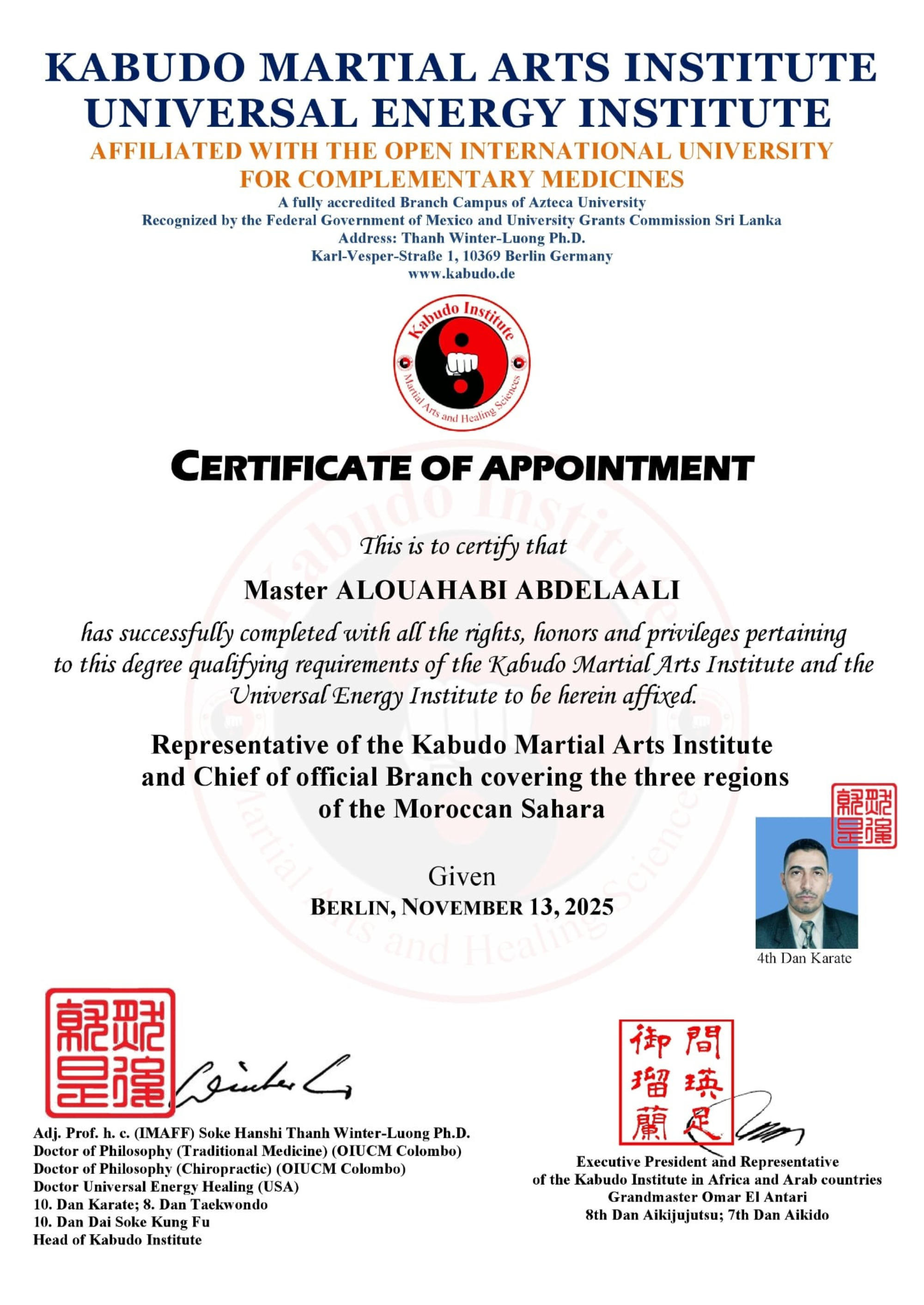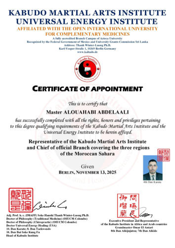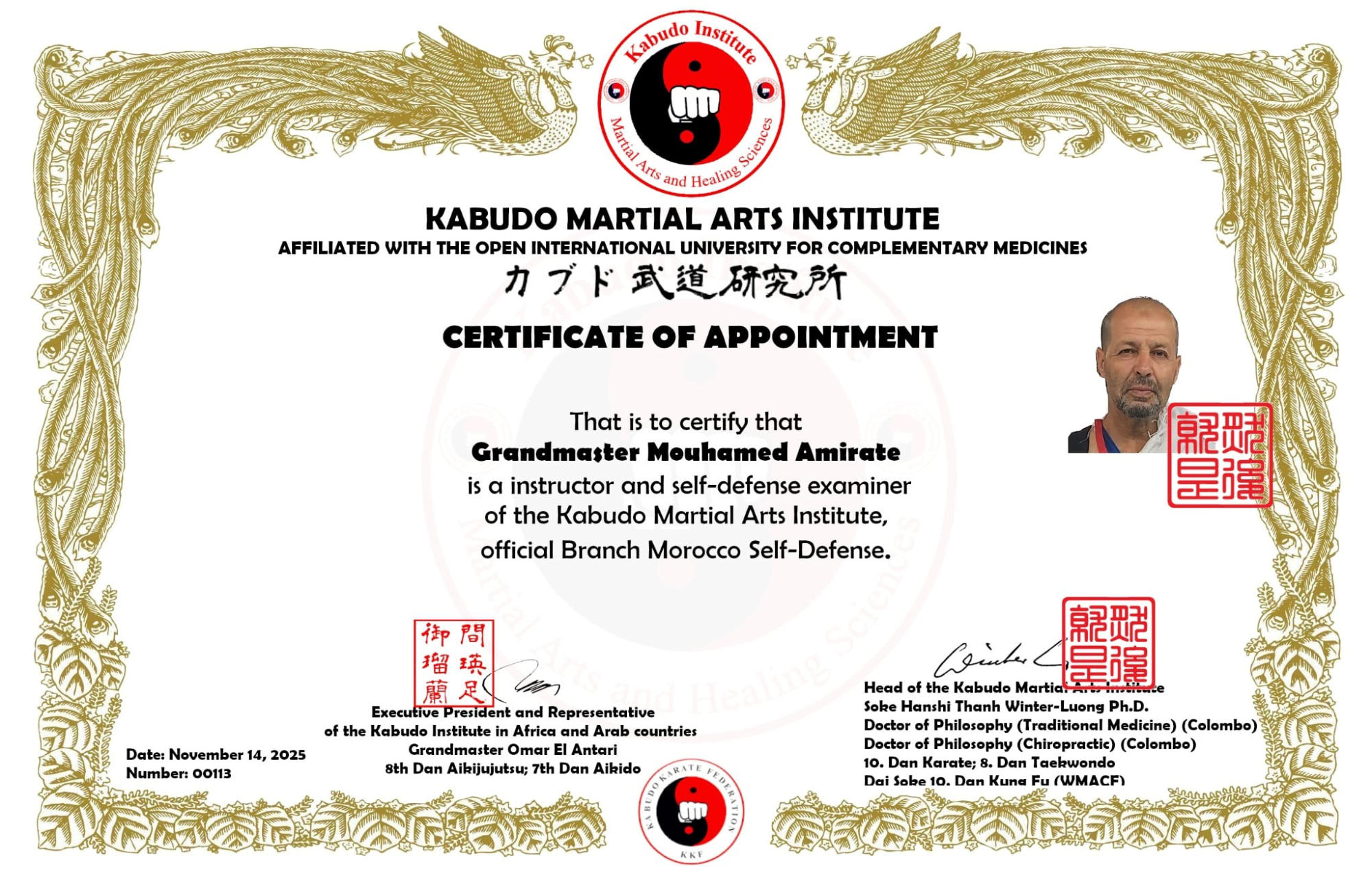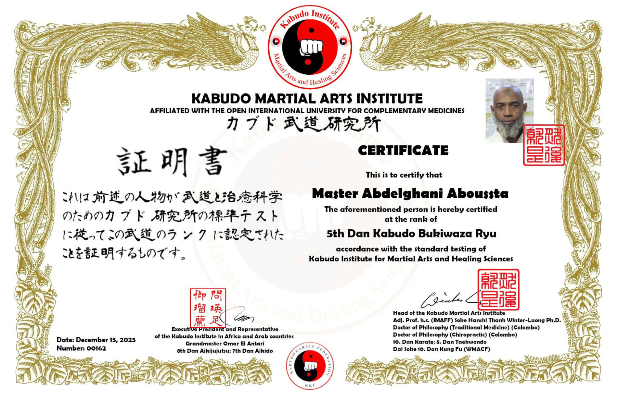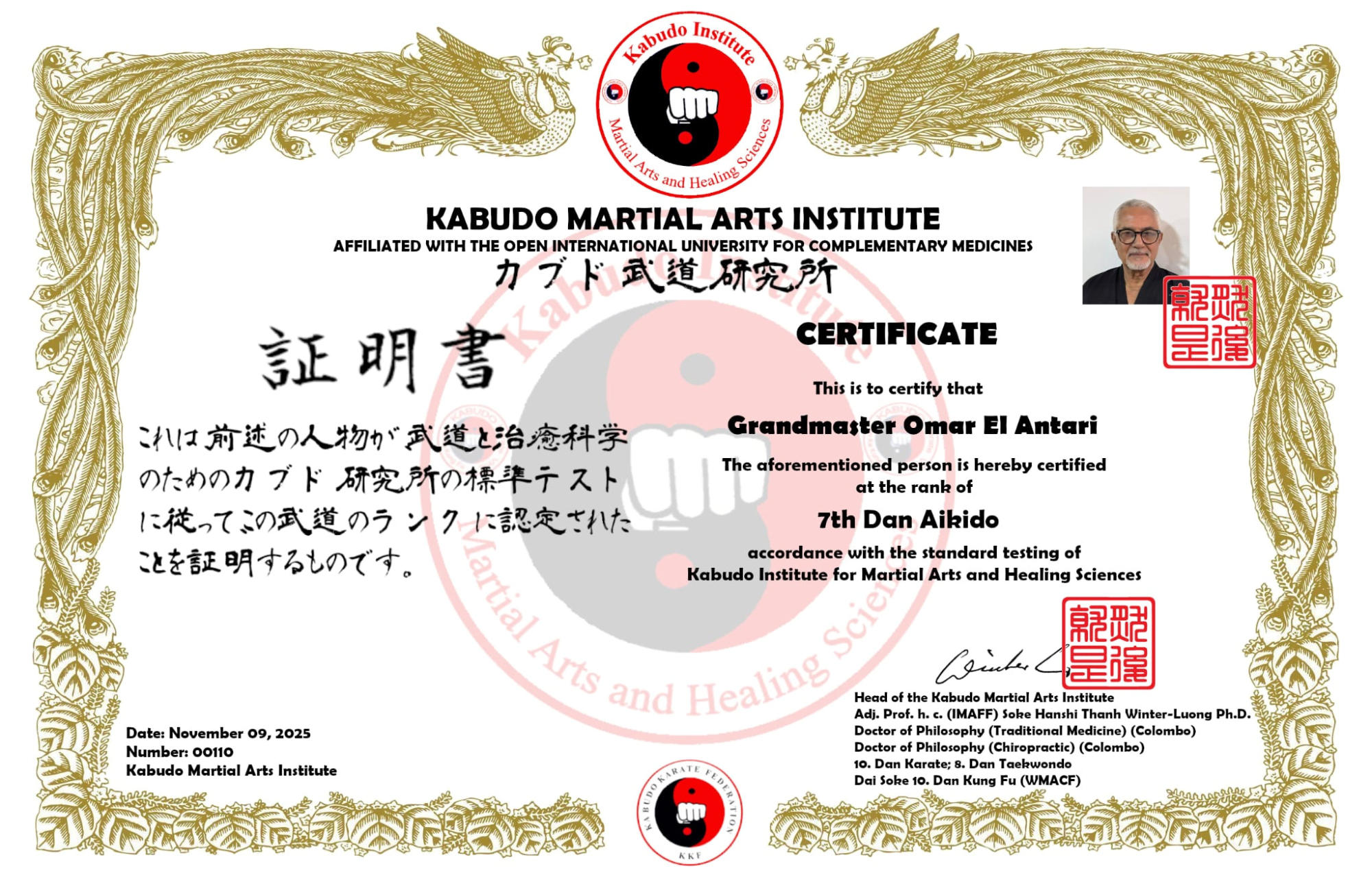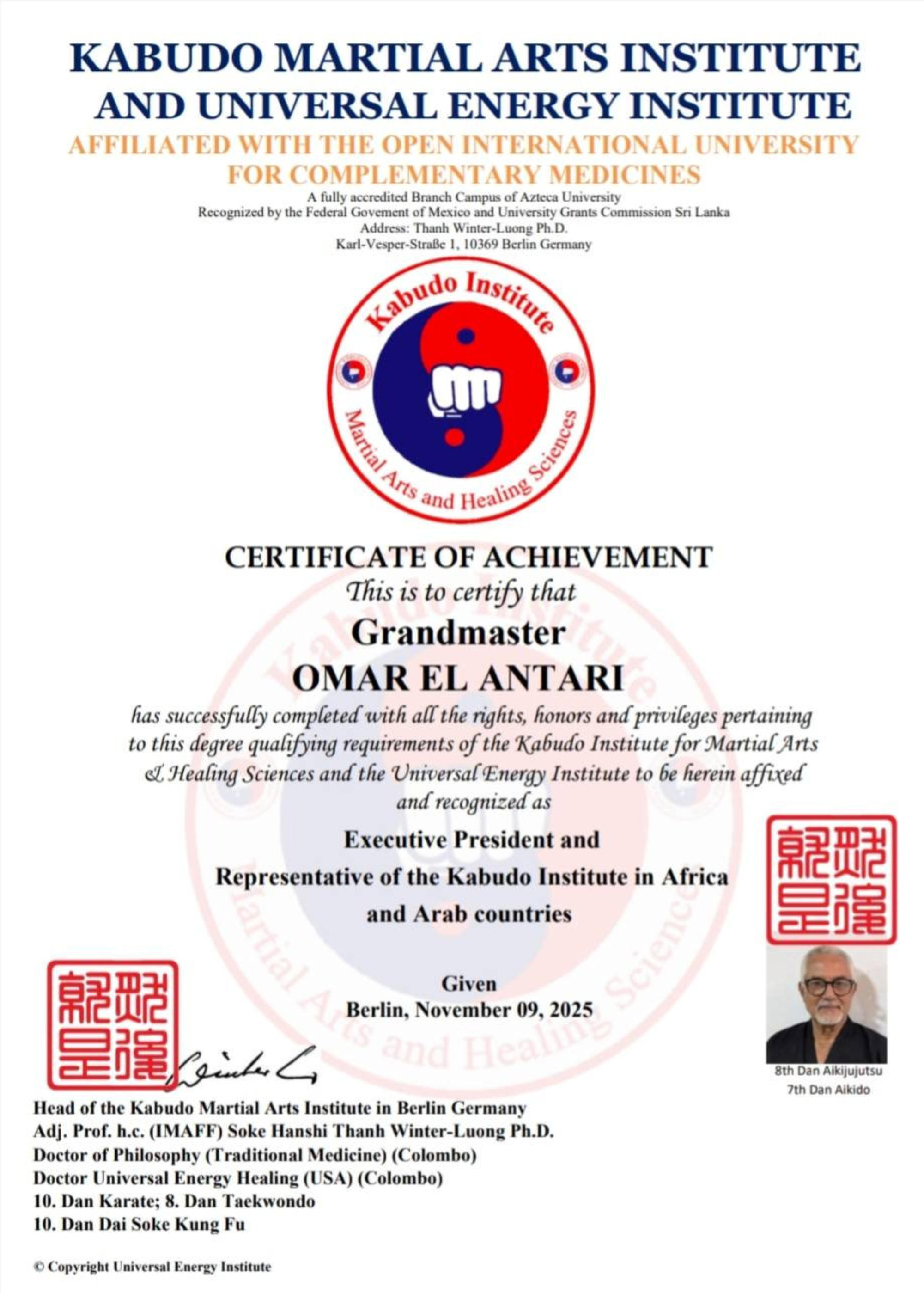 Großmeister: Omar El AntariPresident and Representative of Kabudo Martial Arts Institute in Africa and Arab Countries8. Dan Black Belt Aikijujutsu7. Dan Black Belt Aikido