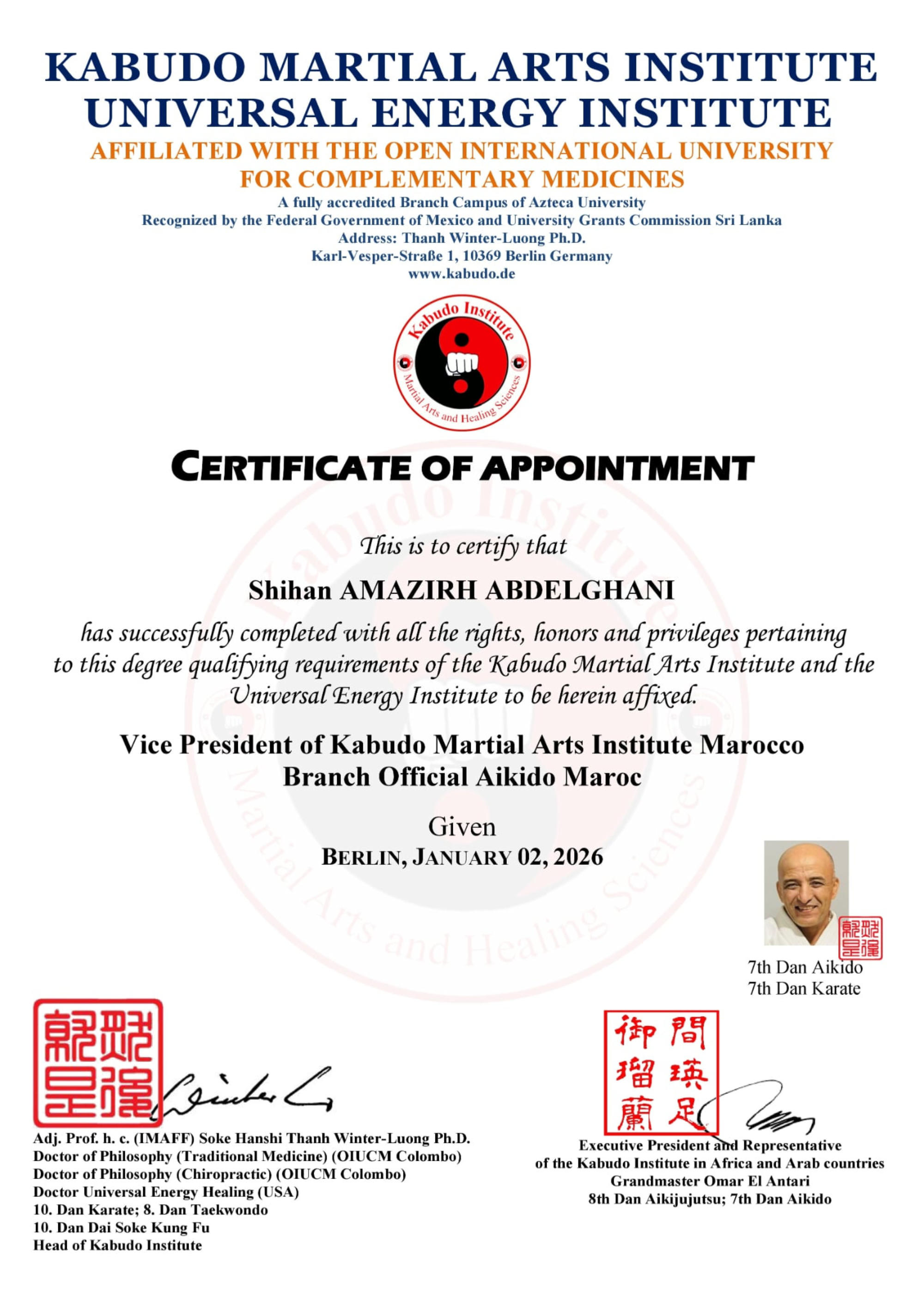 Shihan Amazirh Abdelghani7th Dan Karate KABUDO7th Dan Real Kabudo Self Defense6th Dan Aikido KabudoVice President of Kabudo Martial Arts Institute Morocco