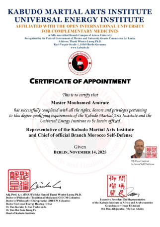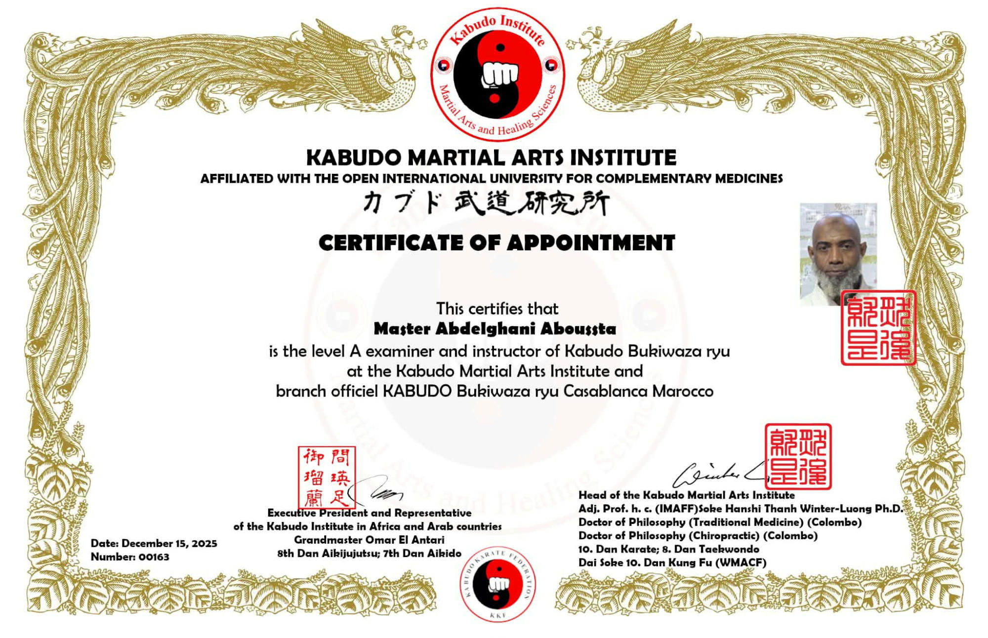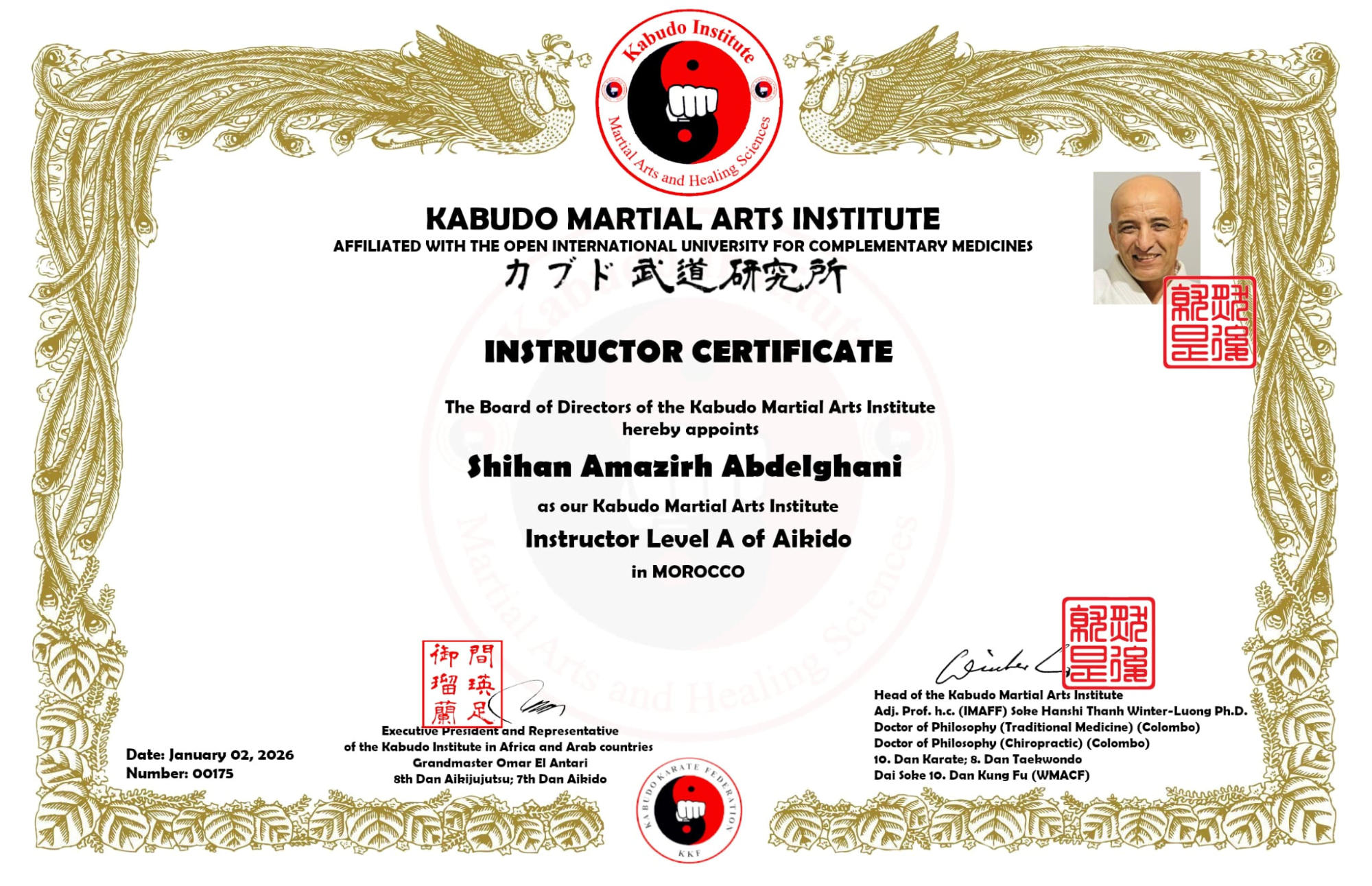 Shihan Amazirh Abdelghani7th Dan Karate KABUDO7th Dan Real Kabudo Self Defense6th Dan Aikido KabudoVice President of Kabudo Martial Arts Institute Morocco