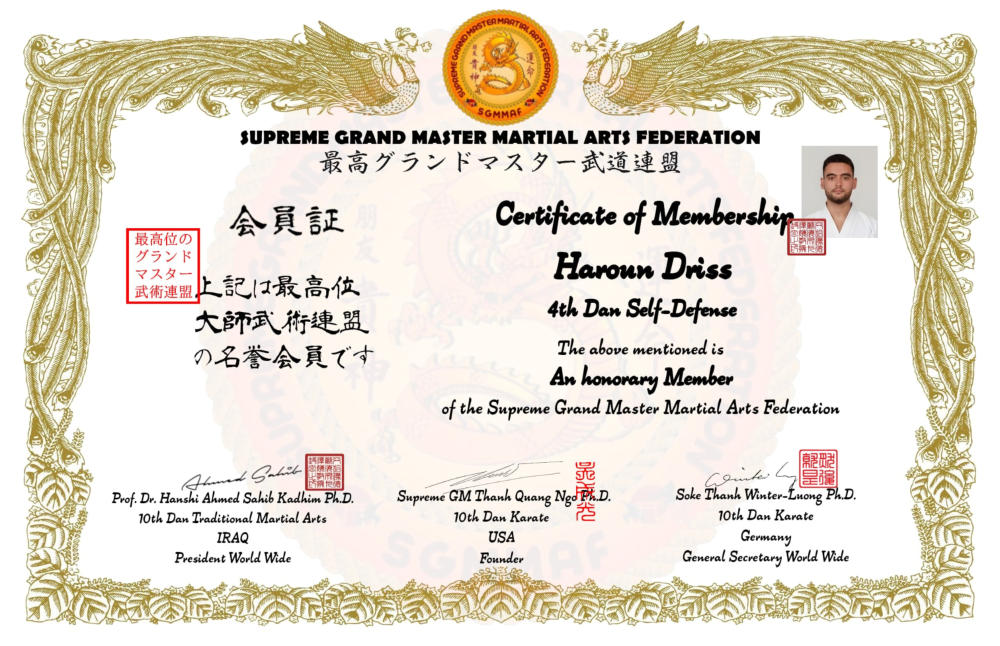 Vice President Adj. Prof. h.c. (IMAFF) Soke Hanshi Thanh Winter-Luong Ph.D (T.M)Doctor of Philosophy (Traditional Medicine) (OIUCM Colombo)Doctor of Philosophy (Chiropractic) (OIUCM Colombo)Doctor UE Healing (UE Institute USA)10. Dan Shotokan Karate (STKOJ) (IUMA) (MAA)(NDBKF)10. Dan Kabudo Karate (IUMA)(NDBKF)10. Dan ISGM KUNGFU (WMACF)Dai Soke 10. Dan Kung Fu (WMACF)8. Dan Taekwondo (WASMMAO)(IMAFF)8. Dan Kobudo (DBV)8. Dan Kick Boxing DBV4. Dan Jiu Jitsu/Tai Jitsu DBVEuropa Secretary General of the World Martial Arts Federation WMAFPräsident Nippon Dai Budo-Kai Germany